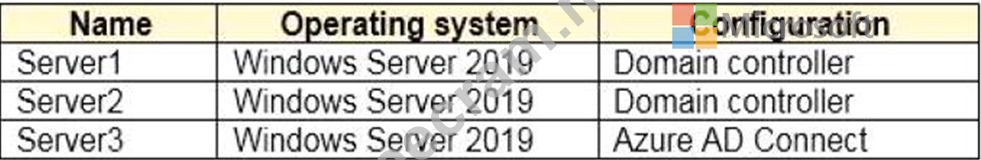 The Azure Active Directory (Azure AD) tenant syncs to an on-premises Active Directory domain. The domain contains the servers shown in the following table.