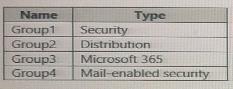 The Azure Active Directory (Azure AD) tenant contains the groups shown in the following table.
