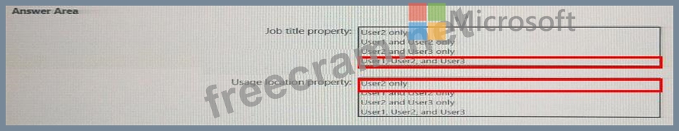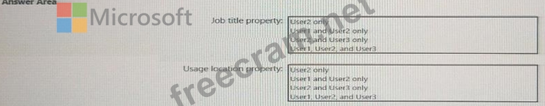 You have an Azure Active Directory (Azure AD) tenant that contains the users shown in the following table. For which users can you configure the Job title property and the Usage location property in Azure AD? To answer, select the appropriate options in the answer area. NOTE: Each correct selection is worth one point.