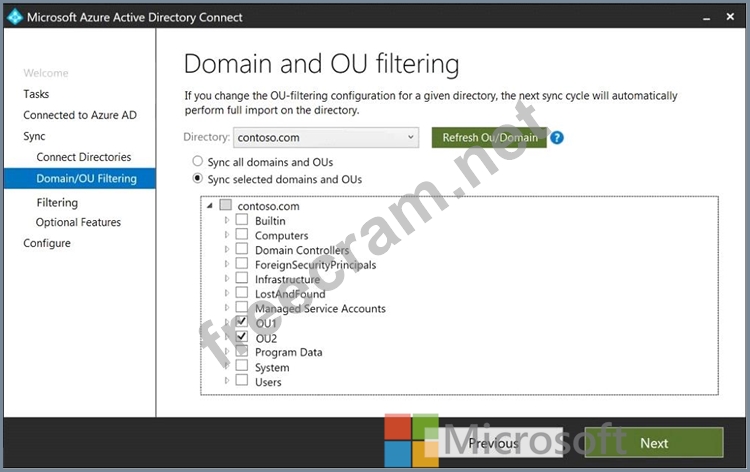 You install Azure AD Connect. You configure the Domain and OU filtering settings as shown in the Domain and OU Filtering exhibit. (Click the Domain and OU Filtering tab.)