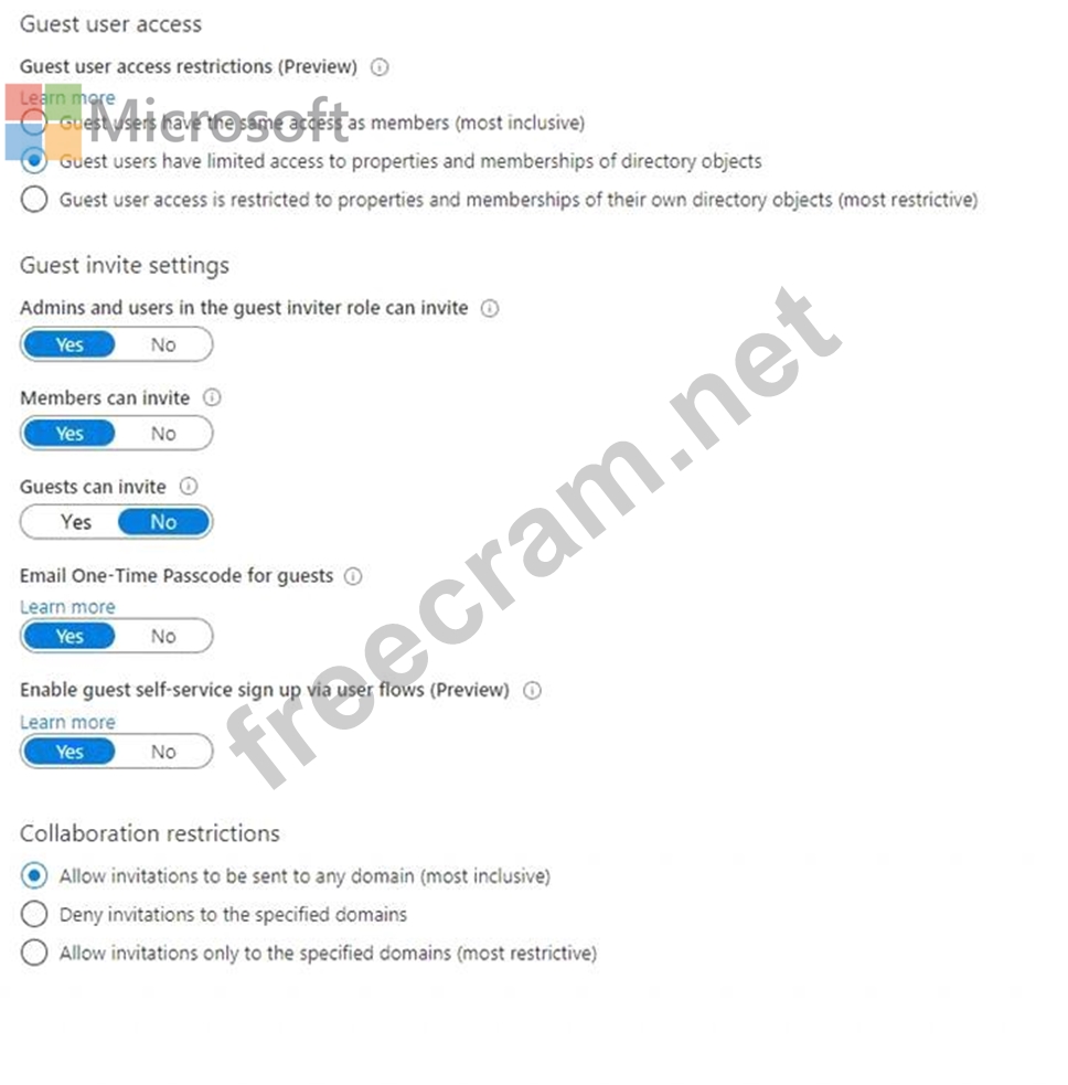 You have a Microsoft 365 tenant that uses the domain named fabrikam.com. The Guest invite settings for Azure Active Directory (Azure AD) are configured as shown in the exhibit. (Click the Exhibit tab.)