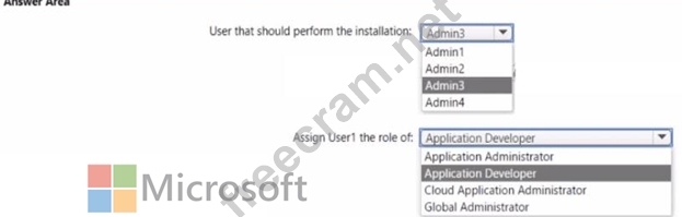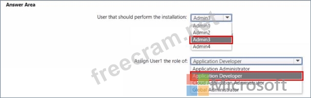 Which user should perform the installation, and which role should you assign to Users1? To answer, select the appropriate options in the answer area.