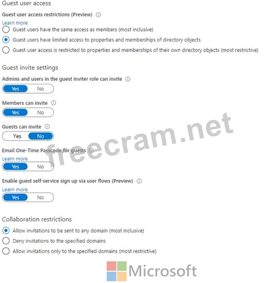 You have a Microsoft 365 tenant that uses the domain named fabrikam.com. The Guest invite settings for Azure Active Directory (Azure AD) are configured as shown in the exhibit. (Click theExhibittab.)