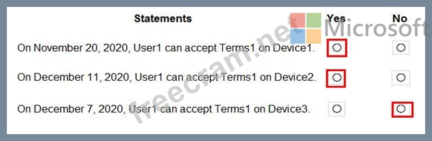 On November 5, 2020, you create and enforce terms of use in contoso.com that has the following settings: