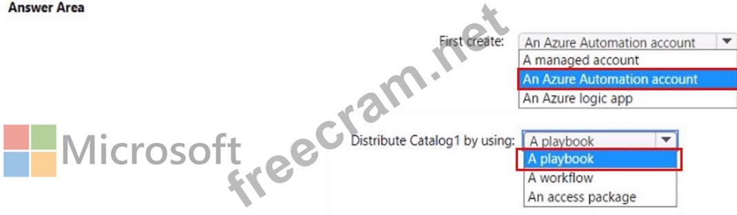 What should you create first and what should you use to distribute Catalog1? To answer, select the appropriate options in the answer area.