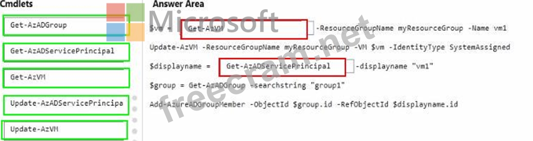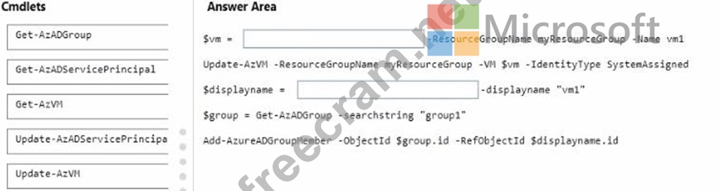 How should you complete the PowerShell script? To answer, drag the appropriate cmdlets to the correct targets. Each cmdlet may be used once, more than once, or not at all. You may need to drag the split bar between panes or scroll to view content.