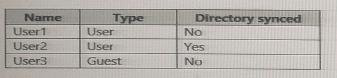 Your network contains an on-premises Active Directory domain that sync to an Azure Active Directory (Azure AD) tenant. The tenant contains the shown in the following table.