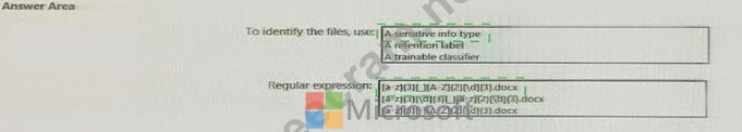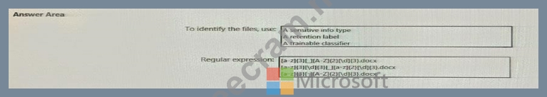 At the end of a project you upload project documents to a Microsoft SharePoint Online library that contains many fifes. Files that have the following naming format must be labeled as Project I * aei_AA989.docx * bd_WSOgadocx * cei_DLF112-docx * ebc_QQ4S4.docx * ecc_BB565.docx You plan to create an auto-apply retention label policy. What should you use to identify the files, and which regular expression should you use? To answer, select the appropriate options in the answer area.