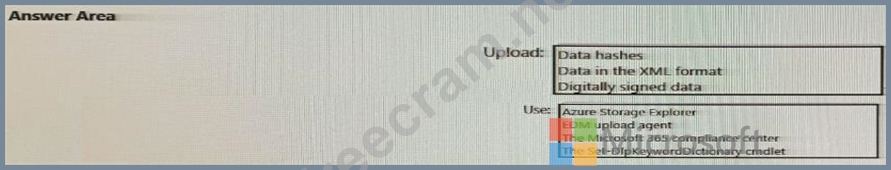 You plan to create a custom sensitive information type that will use Exact Data Match (EDM). You need to identify what to upload to Microsoft 365, and which tool to use for the upload. What should you identify? To answer, select the appropriate options in the answer area. NOTE: Each correct selection is worth one point.