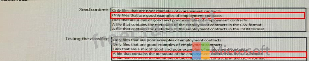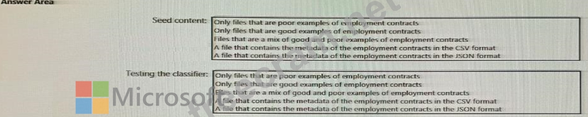 You plan to implement a sensitive information type based on a trainable classifier. The sensitive information type will identify employment contracts. You need to copy the required files to Microsoft SharePoint Online folders to train the classifier. What should you use to seed content and test the classifier? To answer, select the appropriate options in the answer area. NOTE: Each correct selection is worth one point.