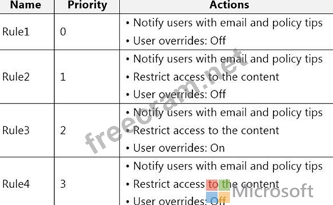 You have a data loss prevention (DLP) policy that has the advanced DLP rules shown in the following table.