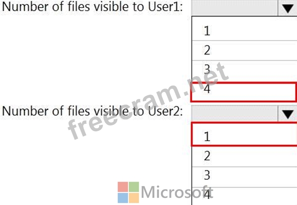 How many files in Site2 will be visible to User1 and User2 after you turn on DLPpolicy1? To answer, select the appropriate options in the answer area.