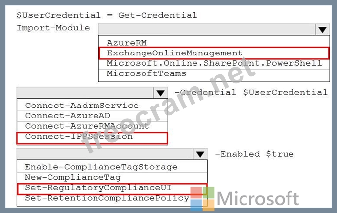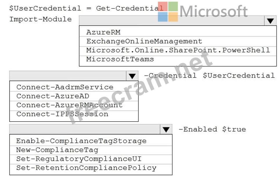 How should you complete the PowerShell script? To answer, select the appropriate options in the answer area.