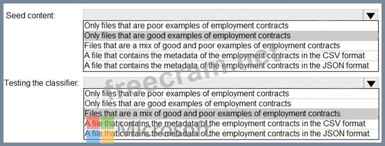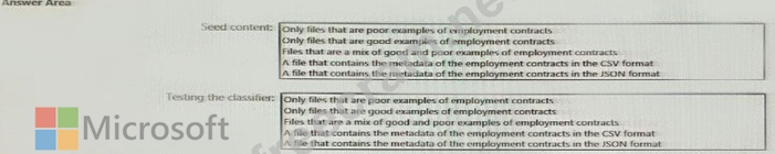 What should you use to seed content and test the classifier? To answer, select the appropriate options in the answer area.