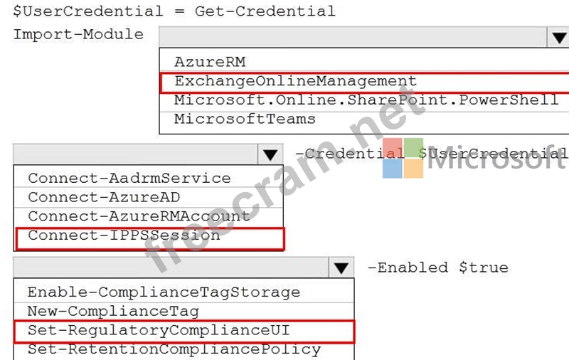 How should you complete the PowerShell script? To answer, select the appropriate options in the answer area.