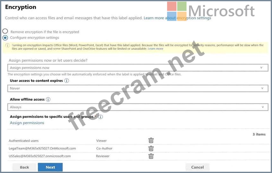 The Encryption settings for the sensitivity label are configured as shown in the exhibit.