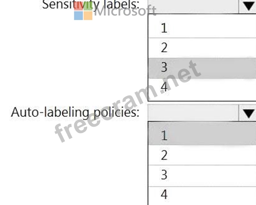 What is the minimum number of sensitivity labels and auto-labeling policies you should create? To answer, select the appropriate options in the answer area.
