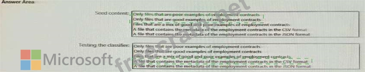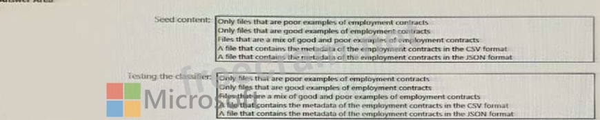 What should you use to seed content and test the classifier? To answer, select the appropriate options in the answer area.