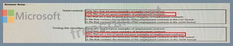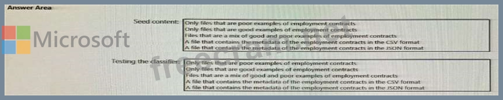 What should you use to seed content and test the classifier? To answer, select the appropriate options in the answer area.