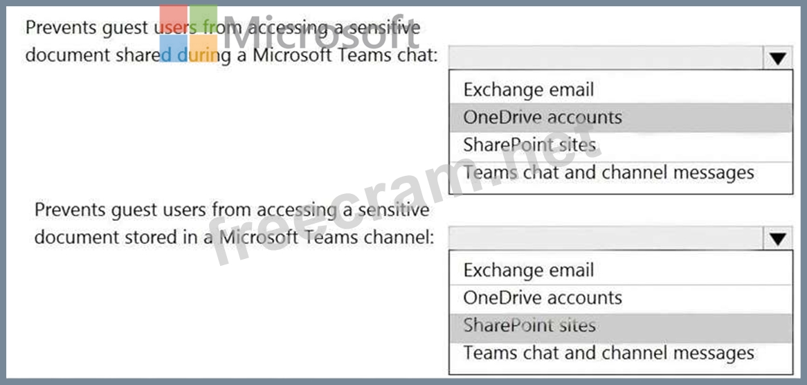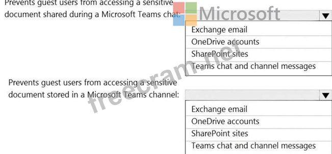* Prevents guest users from accessing a sensitive document stored in a Microsoft Teams channel Which location should you select for each requirement? To answer, select the appropriate options in the answer area.