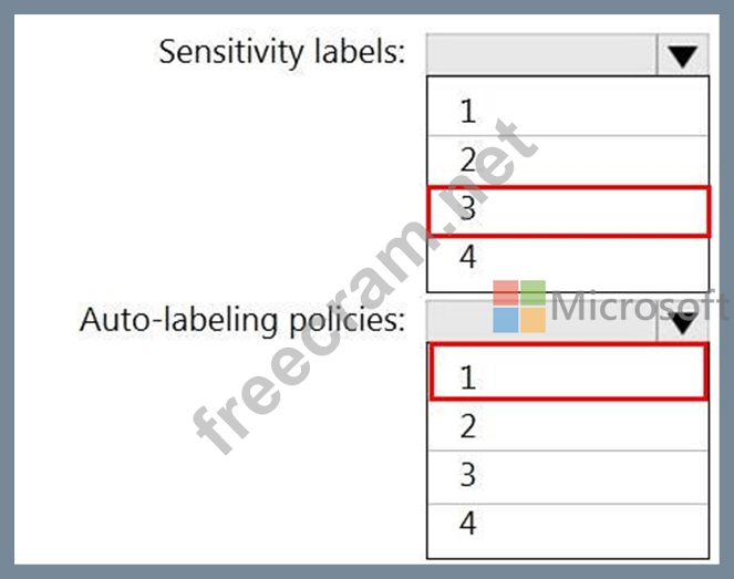 What is the minimum number of sensitivity labels and auto-labeling policies you should create? To answer, select the appropriate options in the answer area.