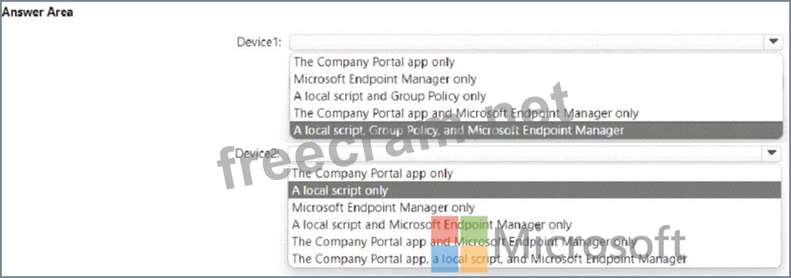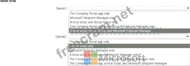 You need to onboard the devices to Microsoft Purview. The solution must ensure that you can apply Endpoint data loss prevention (Endpoint DLP) policies to the devices. What can you use to onboard each device? To answer, select the appropriate options in the answer area.