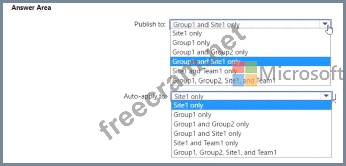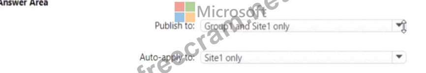 You can publsih a sensivity label to Users or Groups (Only these; Distribution groups, Microsoft 365 groups, and mail-enabled security groups). So for Publish To: "Group1 only" is correct selection. Auto-apply to: Group1 and Site1 only based on my live tests.
