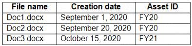 Users apply the retention label policy to files and set the asset ID as shown in the following table.