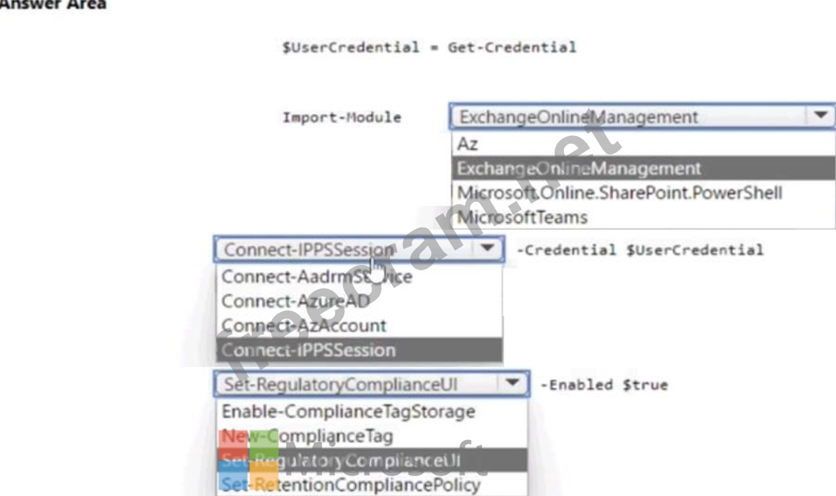How should you complete the PowerShell script? To answer, select the appropriate options in the answer area.