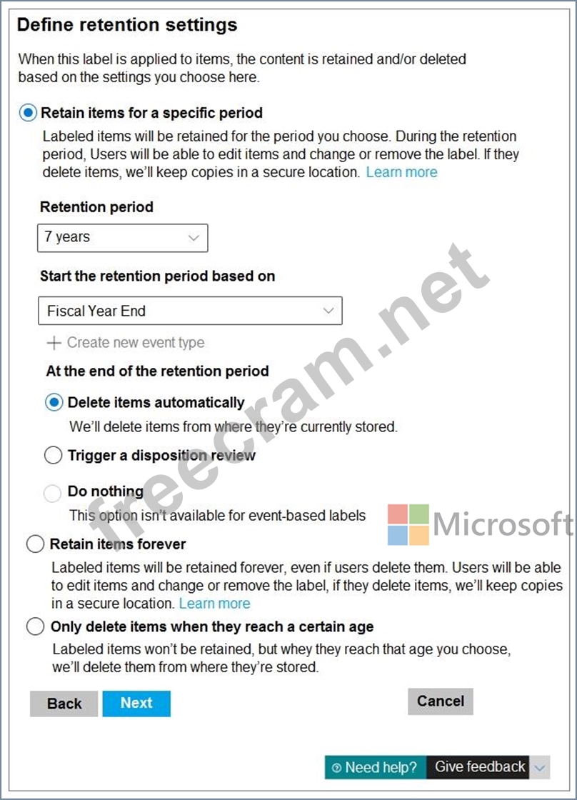 Question 36: You have the retention label policy shown in the Policy exhi...