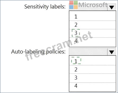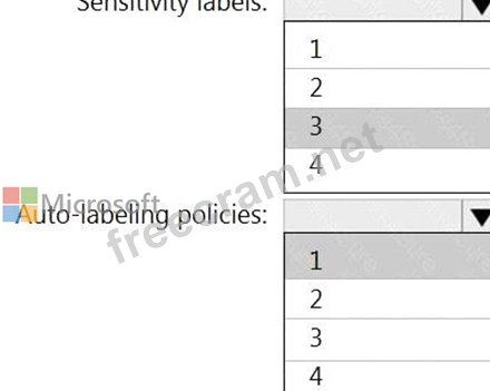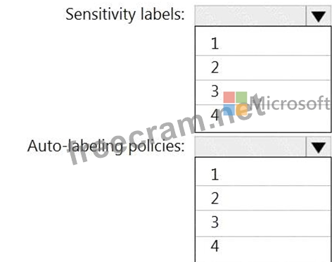 What is the minimum number of sensitivity labels and auto-labeling policies you should create? To answer, select the appropriate options in the answer area.