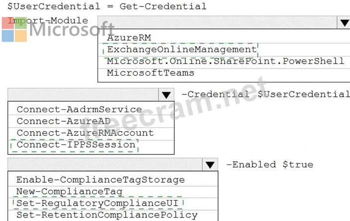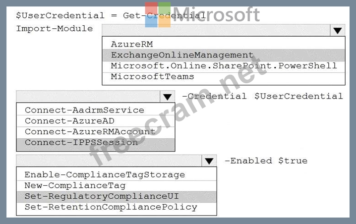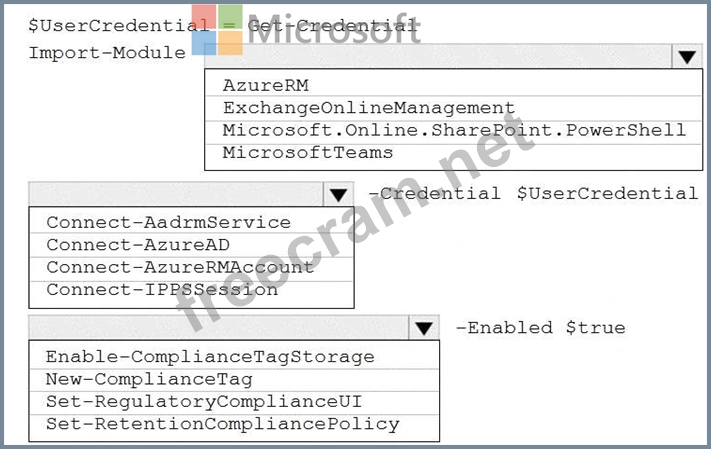 How should you complete the PowerShell script? To answer, select the appropriate options in the answer area.