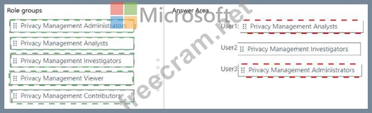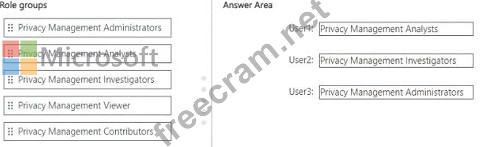 To which role group should you add each user? To answer, drag the appropriate role groups to the correct users. Each group may be used once, more than once, or not at all. You may need to drag the split bar between panes or scroll to view content.