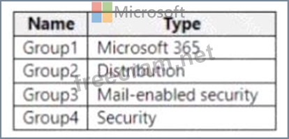 You have a Microsoft 365 E5 subscription that contains a user named User1 and the groups shown in the following table.