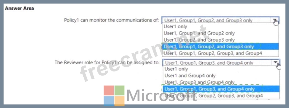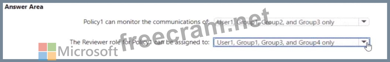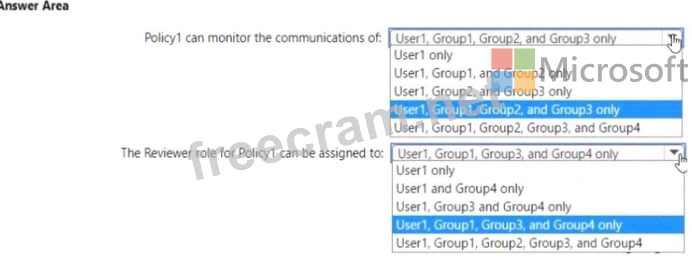You need to identify whose communications can be monitored by Policy1, and who can be assigned the Reviewer role for Policy1.