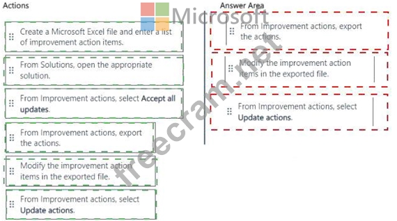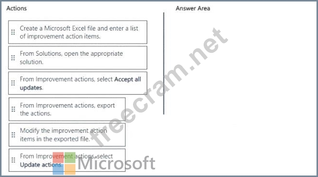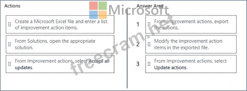Which three actions should you perform in sequence from Microsoft Purview Compliance Manager? To answer, move the appropriate actions from the list of actions to the answer area and arrange them in the correct order.