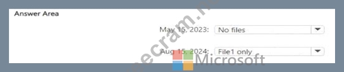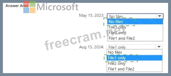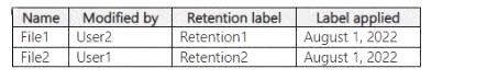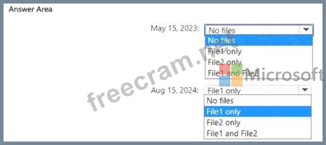 Which files can User1 delete on May 15,2023, and which files can User2 delete on August 15, 2024? To answer, select the appropriate options in the answer area.