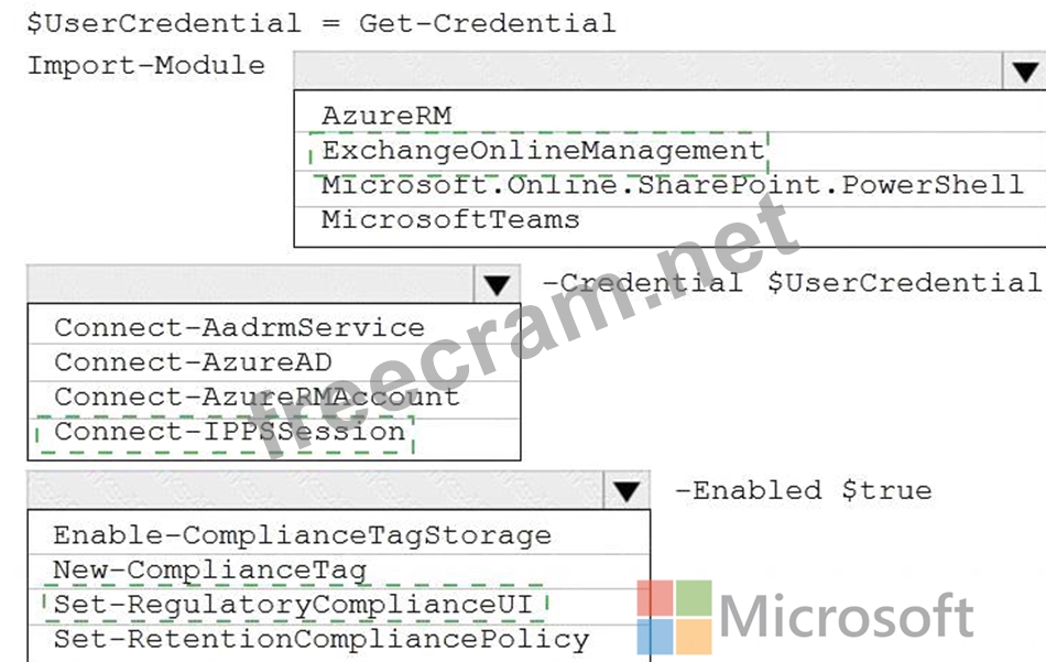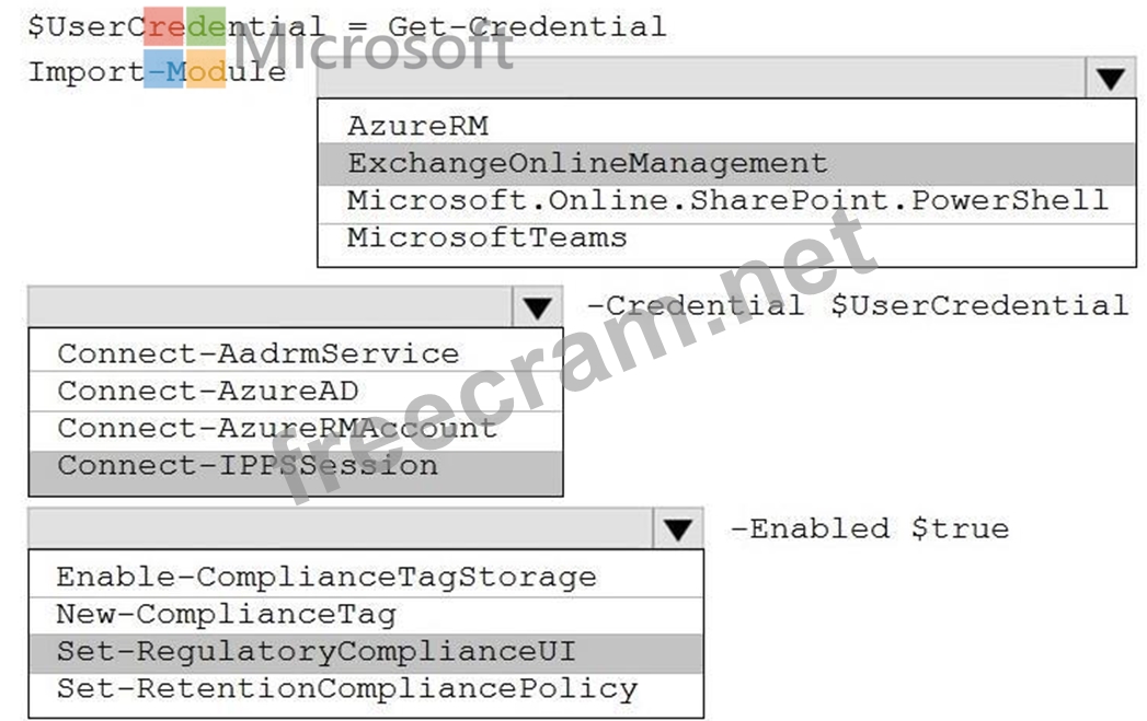 How should you complete the PowerShell script? To answer, select the appropriate options in the answer area.
