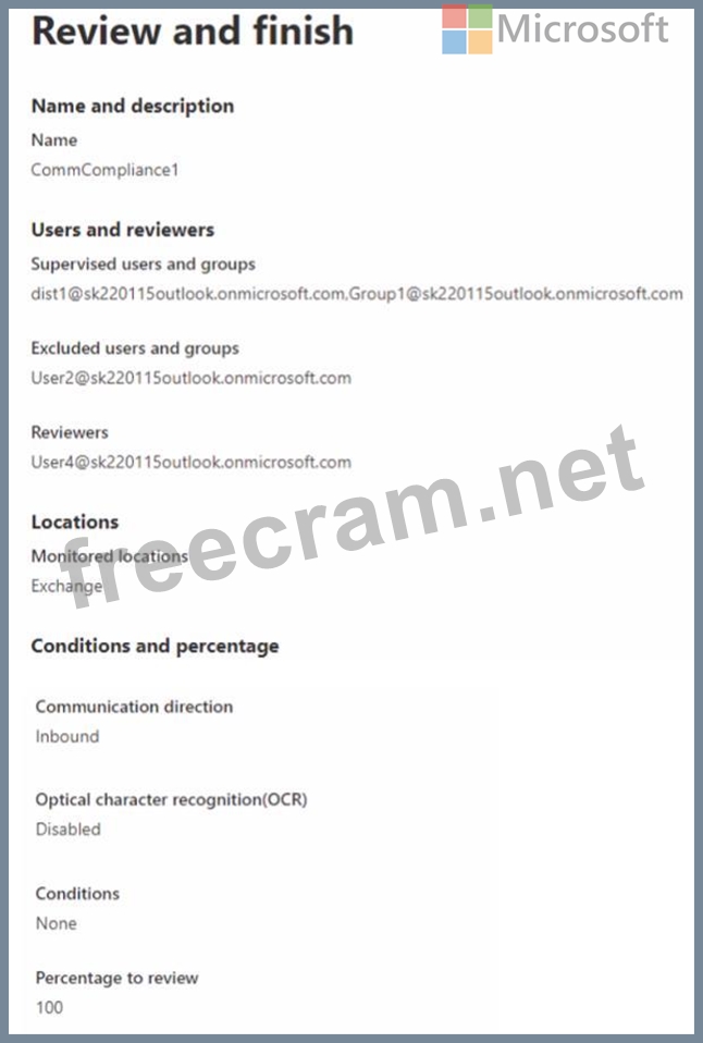 You create the communication compliance policy as shown in the exhibit. (Click the Exhibit tab.)