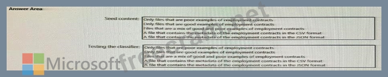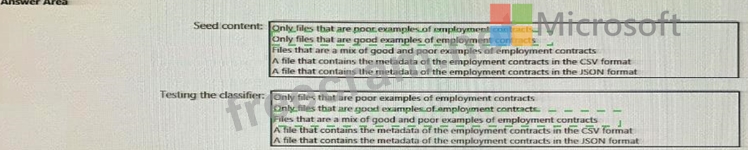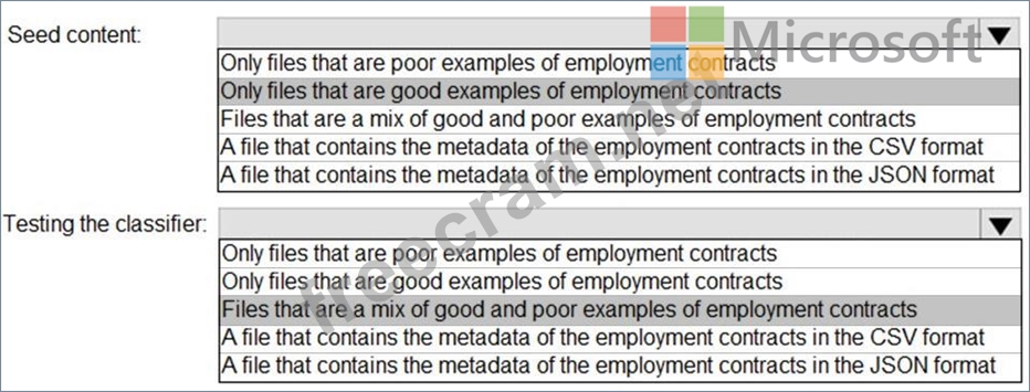 What should you use to seed content and test the classifier? To answer, select the appropriate options in the answer area.