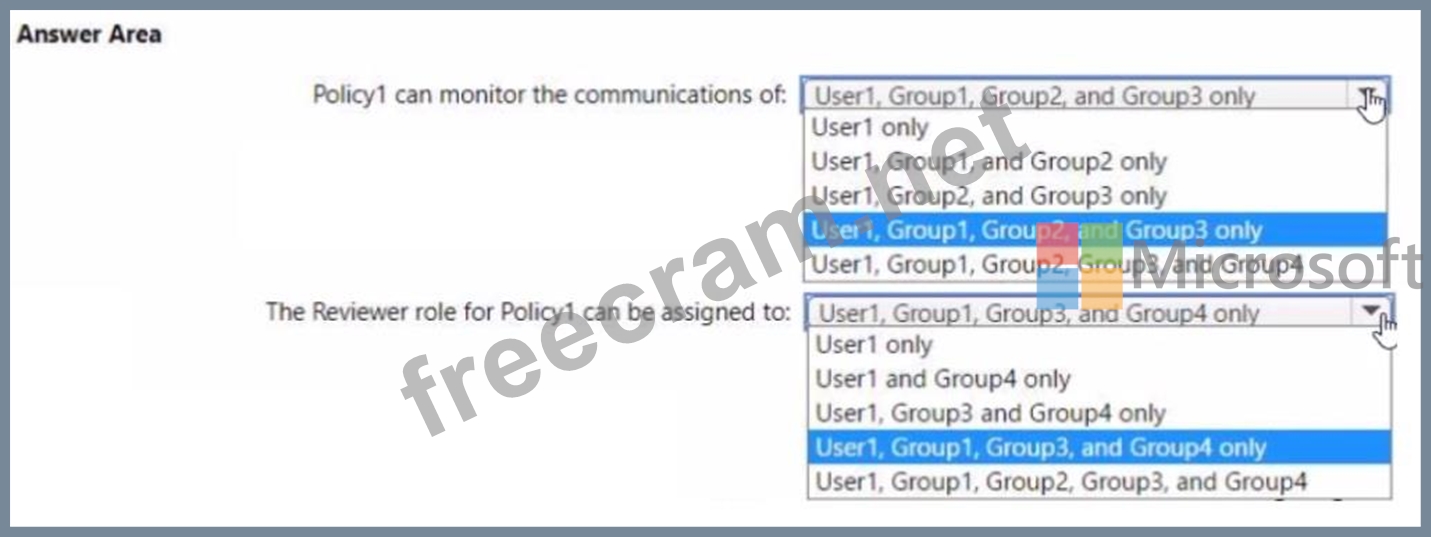 You need to identify whose communications can be monitored by Policy1, and who can be assigned the Reviewer role for Policy1.