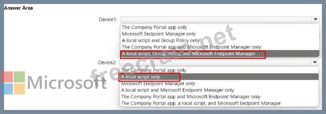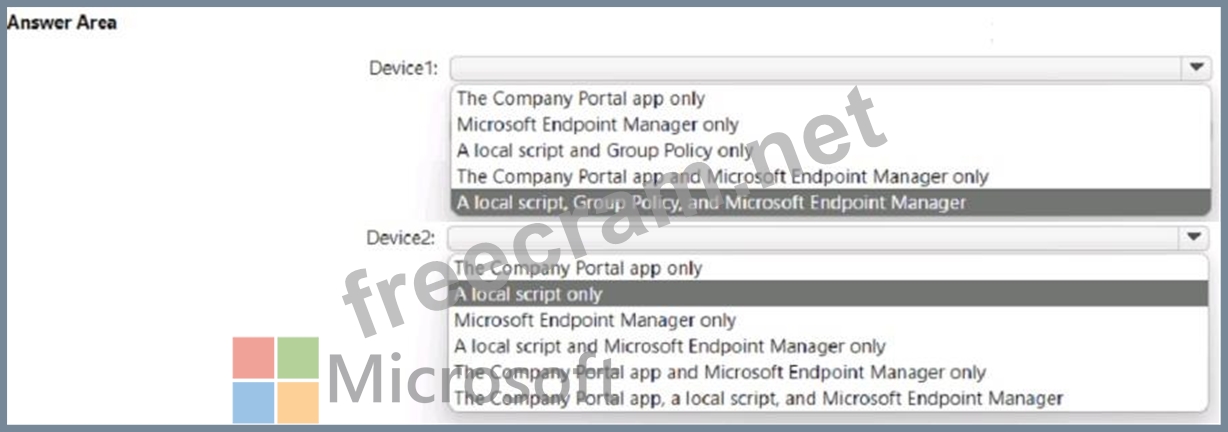 You need to onboard the devices to Microsoft Purview. The solution must ensure that you can apply Endpoint data loss prevention (Endpoint DLP) policies to the devices. What can you use to onboard each device? To answer, select the appropriate options in the answer area.