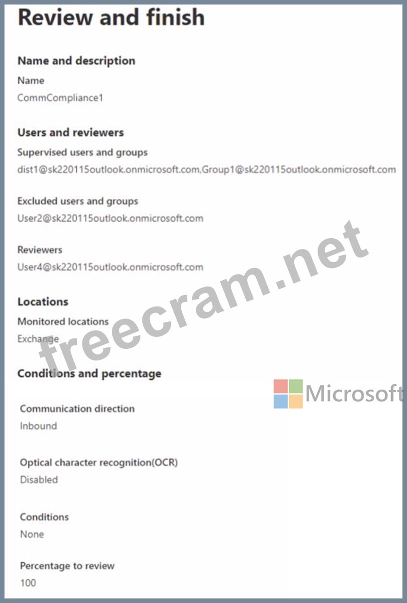 You create the communication compliance policy as shown in the exhibit. (Click the Exhibit tab.)