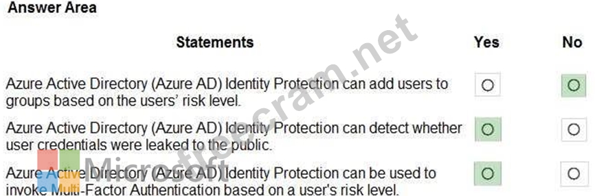 Explanation Graphical user interface, text, application, email Description automatically generated Box 1: No Box 2: Yes Leaked Credentials indicates that the user's valid credentials have been leaked. Box 3: Yes Multi-Factor Authentication can be required based on conditions, one of which is user risk.