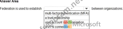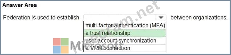 Explanation Graphical user interface, text, application Description automatically generated Federation is a collection of domains that have established trust. Reference: https://docs.microsoft.com/en-us/azure/active-directory/hybrid/whatis-fed