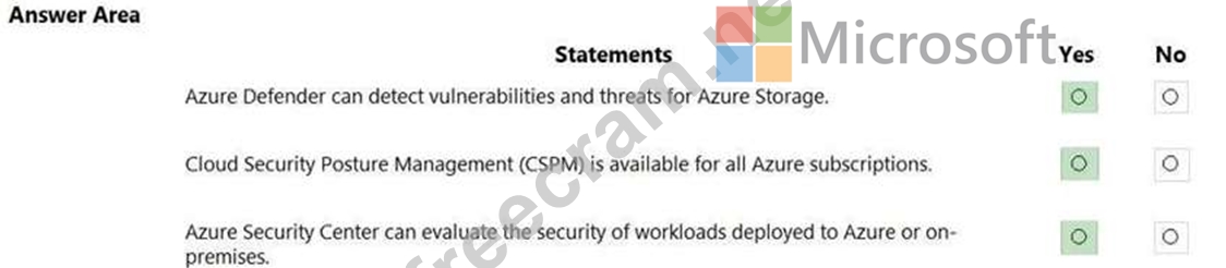 Azure Defender provides security alerts and advanced threat protection for virtual machines, SQL databases, containers, web applications, your network, your storage, and more Box 2: Yes Cloud security posture management (CSPM) is available for free to all Azure users.