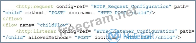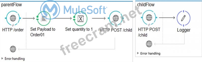 Refer to the exhibits. The parentFlow contains an HTTP Request. The HTTP Listeners and HTTP Request use default configurations. What valuesare accessible in childFlow after a web client submits a request to http://localhost:8081/order?color=red?