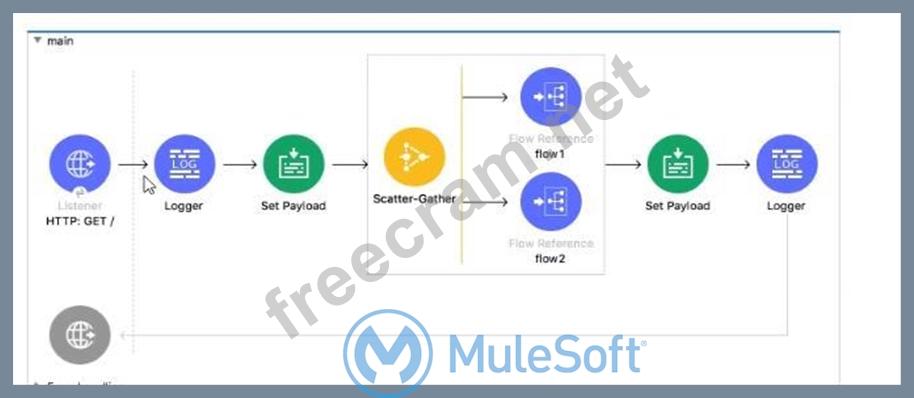 Refer to the exhibit. In the execution of the Scatter_Gather, the flow1 route completes after 10 seconds and the flow2 route completes after 20 seconds. How many seconds does it take for the Scatter_Gather to complete?