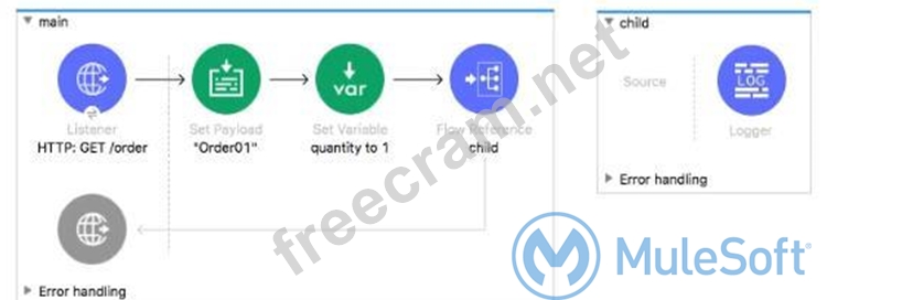 C is the correct answer, try the flow: <flow name="exampl-flow"> <http:listener config-ref="HTTP_Listener_config" path="/order"/> <set-payload value="order01"/> <set-variable variableName="quantity" value="1"/> <flow-ref name="child-flow"/> </flow>