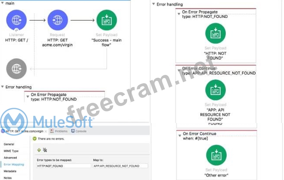Refer to the exhibit. The main flow is configured with their error handlers. A web client submit a request to the HTTP Listener and the HTTP Request throws an HTTP:NOT_FOUND error. What response message is returned?'' What response message is returned?
